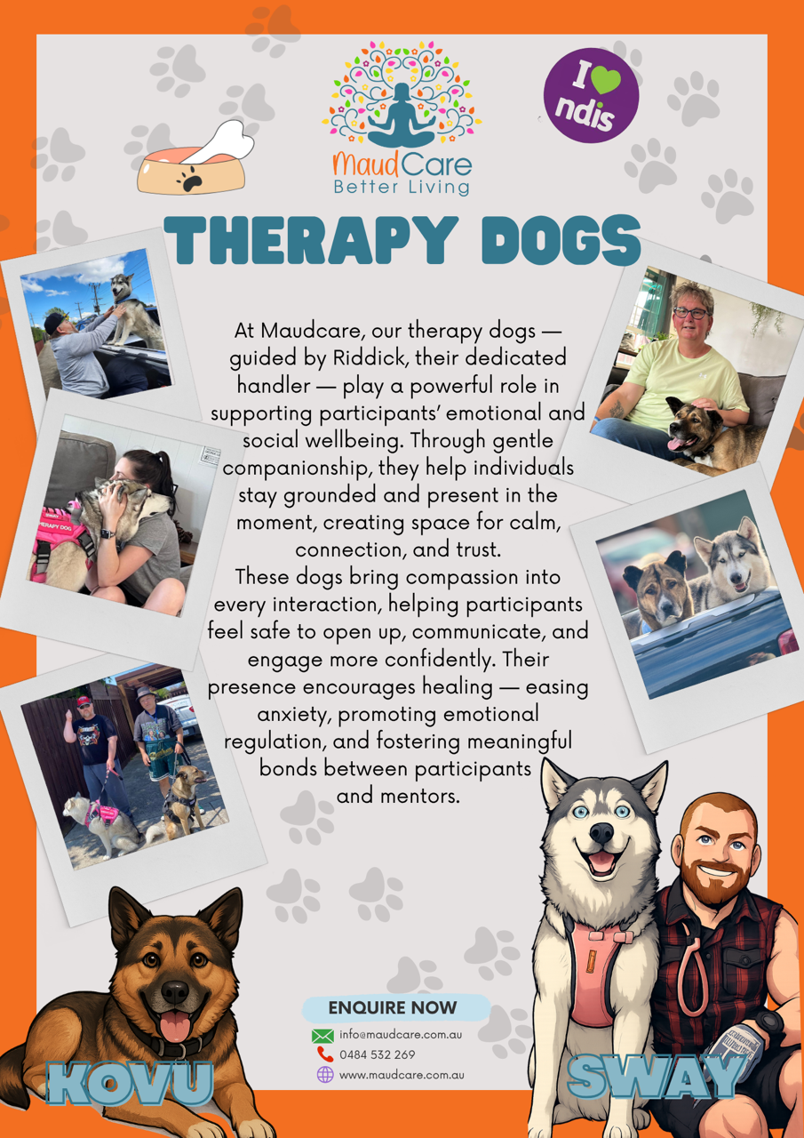 Riddick and his therapy dogs, Sway and Kovu, bring comfort, confidence, and connection to Maudcare programs, helping participants relax, open up, and build skills in a calm, supportive way.